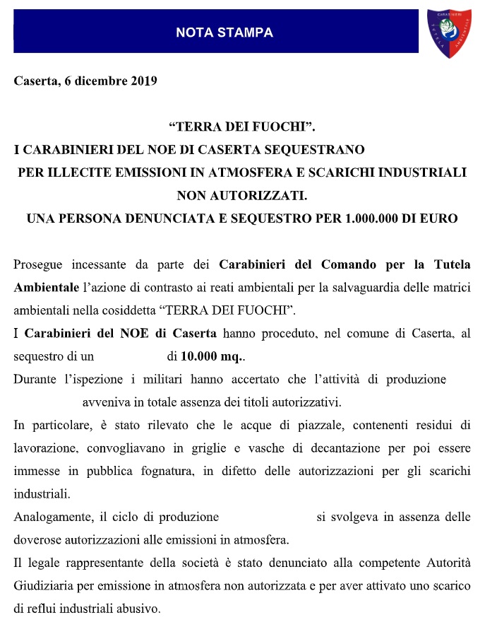 Pubblichiamo nota stampa dei Carabinieri del NOE