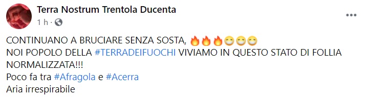 Questo quanto apprendiamo dalla sempre ottima pagina fb Terra Nostrum: "CONTINUANO A BRUCIARE SENZA SOSTA NOI POPOLO DELLA TERRA DEI FUOCHI VIVIAMO IN QUESTO STATO DI FOLLIA NORMALIZZATA!!! Poco fa tra Afragola e Acerra ... Aria irrespirabile".