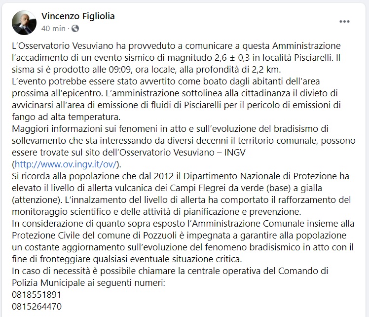Questo quanto pubblicato sulla pagina fb del Sindaco di Pozzuoli