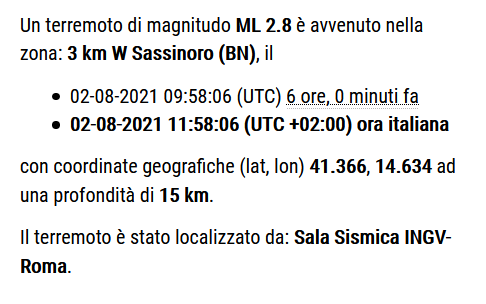 Questo quanto si apprende dal sito dell'INGV: " Un terremoto di magnitudo ML 2.8 è avvenuto nella zona: 3 km W Sassinoro (BN), il 02-08-2021 09:58:06 (UTC) 6 ore, 5 minuti fa 02-08-2021 11:58:06 (UTC +02:00) ora italiana con coordinate geografiche - si legge -(lat, lon) 41.366, 14.634 ad una profondità di 15 km. Il terremoto è stato localizzato da: Sala Sismica INGV-Roma".
