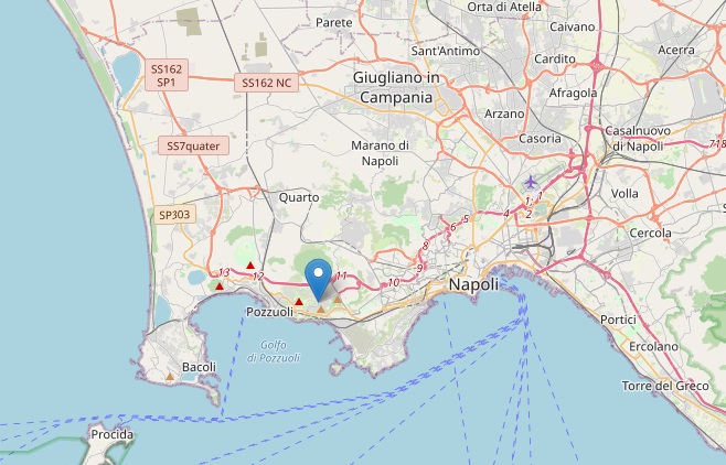 "Un terremoto di magnitudo Md 2.7 è avvenuto nella zona: Campi Flegrei, il 26-04-2023 03:03:19 (UTC). 26-04-2023 05:03:19 (UTC +02:00) ora italiana- si legge nella nota- con coordinate geografiche (lat, lon) 40.8270, 14.1520 ad una profondità di 2 km. Il terremoto è stato localizzato da: Sala Operativa INGV-OV (Napoli)."
