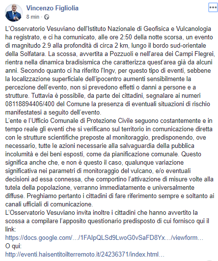 "L'Osservatorio Vesuviano dell'Istituto Nazionale di Geofisica e Vulcanologia ha registrato, e ci ha comunicato, alle ore 2:50 della notte scorsa, un evento di magnitudo 2.9 alla profondità di circa 2 km, lungo il bordo sud-orientale della Solfatara. La scossa, avvertita a Pozzuoli e nell'area dei Campi Flegrei, rientra nella dinamica bradisismica che caratterizza quest'area già da alcuni anni. Secondo quanto ci ha riferito l'Ingv, per questo tipo di eventi, sebbene la localizzazione superficiale dell’ipocentro aumenti sensibilmente la percezione dell’evento, non si prevedono effetti o danni a persone e a strutture. Tuttavia è possibile, da parte dei cittadini, segnalare ai numeri 08118894406/400 del Comune la presenza di eventuali situazioni di rischio manifestatesi a seguito dell’evento. L’ente e l’Ufficio Comunale di Protezione Civile seguono costantemente e in tempo reale gli eventi che si verificano sul territorio in comunicazione diretta con le strutture scientifiche preposte al monitoraggio, predisponendo, ove necessario, tutte le azioni necessarie alla salvaguardia della pubblica incolumità e dei beni esposti, come da pianificazione comunale. Questo significa anche che, e non è questo il caso, qualunque variazione significativa nei parametri di monitoraggio del vulcano, e/o eventuali decisioni ad essa connessa, che comportino l’attivazione di misure volte alla tutela della popolazione, verranno immediatamente e universalmente diffuse. Preghiamo pertanto i cittadini di fare riferimento sempre e soltanto ai canali ufficiali di comunicazione. L’Osservatorio Vesuviano invita inoltre i cittadini che hanno avvertito la scossa a compilare l’apposito questionario predisposto di cui fornisco qui il link:https://docs.google.com/…/1FAIpQLSd9LwoG0vSaFD8Yx…/viewform…O qui: http://eventi.haisentitoilterremoto.it/24236371/index.html…"