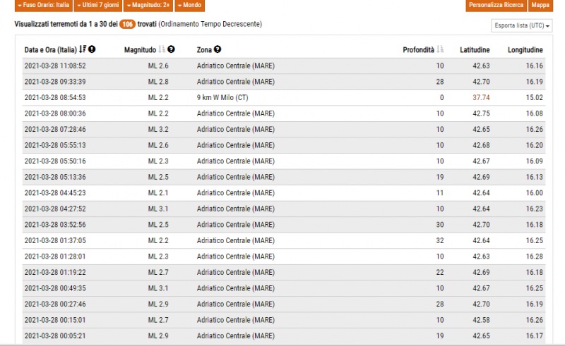 Riportiamo il report terremoti dell'Ingv relativo alla giornata di oggi. Come si può notare è in corso uno sciame sismico dopo la scossa avvenuta ieri nell'Adriatico centrale (ml 5.2) che intorno alle 15 è stata avvertita in varie zone della Campania e del Sud Italia. Per fortuna le scosse di questa notte e di questa mattina, diverse decine, non hanno mai superato la magnitudo 3.2 e pare, non siano state neppure percepite dalla popolazione.