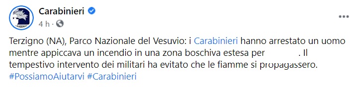 "Terzigno (NA), Parco Nazionale del Vesuvio: i Carabinieri hanno arrestato un uomo mentre appiccava un incendio in una zona boschiva estesa per ... -Si legge nella nota- Il tempestivo intervento dei militari ha evitato che le fiamme si propagassero."