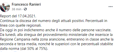 Questo il post pubblicato dal Sindaco di Terzigno Francesco Ranieri sulla sua pagina Facebook: "Report del 17.04.2021. Continua la discesa del numero degli attuali positivi. Percentuali in linea con quelle regionali. Da oggi in poi - si legge nel post - indicheremo anche il numero delle persone vaccinate. Da lunedì, alla stregua del provvedimento ministeriale che inserisce la Regione Campania nella zona arancione, entreranno in classe anche la seconda e terza media, nonché le superiori - conclude il post - con le percentuali stabilite dalla norma (dal 50% al 75%)".