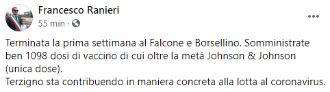 Questo il post pubblicato dal Sindaco di Terzigno Francesco Ranieri sulla sua pagina Facebook: "Terminata la prima settimana al Falcone e Borsellino. Somministrate ben 1098 dosi di vaccino di cui oltre la metà Johnson & Johnson (unica dose). Terzigno - si legge nel post - sta contribuendo in maniera concreta alla lotta al coronavirus".