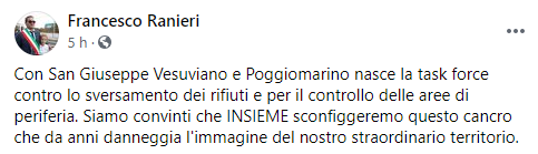 Questo il post pubblicato dal Sindaco di Terzigno Francesco Ranieri sulla sua pagina Facebook: "Con San Giuseppe Vesuviano e Poggiomarino nasce la task force contro lo sversamento dei rifiuti - si legge nel post - e per il controllo delle aree di periferia. Siamo convinti che INSIEME sconfiggeremo questo cancro che da anni danneggia l'immagine del nostro straordinario territorio".