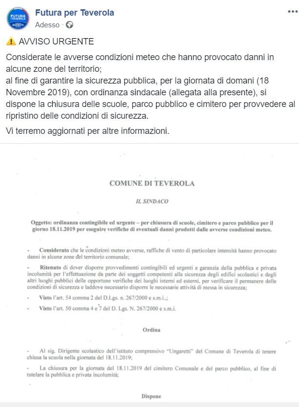 Questo quanto pubblicato sulla pagina Facebook di Futura per Teverola: