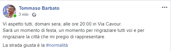 Questo il post pubblicato su Facebook dal neosindaco di Teverola Tommaso Barbato: