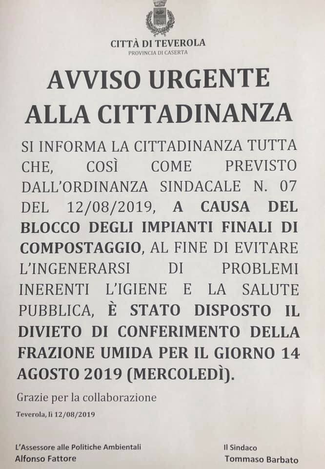 Questo l'avviso urgente del Comune di Teverola in relazione alla raccolta dei rifiuti in città. Immagine di repertorio