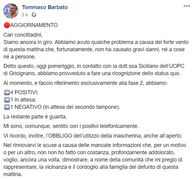 Questo quanto apprendiamo dal profilo facebook del Sindaco Barbato: