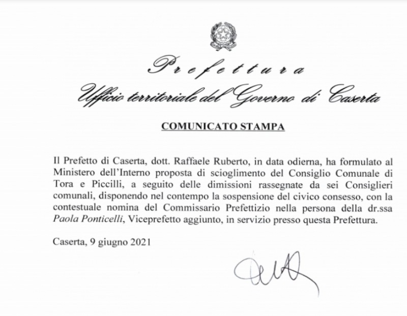 Questa la nota stampa della Prefettura di Caserta: