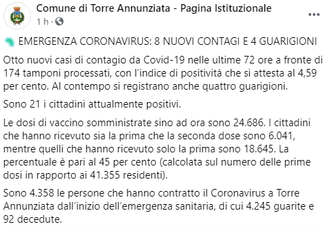Questo il post pubblicato sulla pagina Facebook 'Comune di Torre Annunziata - Pagina istituzionale': "EMERGENZA CORONAVIRUS: 8 NUOVI CONTAGI E 4 GUARIGIONI. Otto nuovi casi di contagio da Covid-19 nelle ultime 72 ore a fronte di 174 tamponi processati, con l’indice di positività che si attesta - si legge nel post - al 4,59 per cento. Al contempo si registrano anche quattro guarigioni. Sono 21 i cittadini attualmente positivi. Le dosi di vaccino somministrate sino ad ora sono 24.686. I cittadini che hanno ricevuto sia la prima che la seconda dose sono 6.041, mentre quelli che hanno ricevuto solo la prima sono 18.645. La percentuale è pari al 45 per cento (calcolata sul numero delle prime dosi in rapporto ai 41.355 residenti). Sono 4.358 le persone - si legge nel post - che hanno contratto il Coronavirus a Torre Annunziata dall’inizio dell’emergenza sanitaria, di cui 4.245 guarite e 92 decedute".