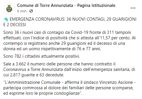 Questo il post pubblicato sulla pagina Facebook 'Comune di Torre Annunziata': "Emergenza Coronavirus: 36 nuovi contagi, 29 guarigioni e 2 decessi. Sono 36 i nuovi casi di contagio da Covid-19 - si legge nel post - fronte di 311 tamponi effettuati, con l’indice di positività che si attesta all’11,57 per cento. Al contempo si registrano anche 29 guarigioni ed il decesso di una donna ed un uomo rispettivamente di 76 e 77 anni. Sono 782 i cittadini attualmente positivi. Sale a 3.662 - continua il post - il numero delle persone che hanno contratto il Coronavirus a Torre Annunziata dall’inizio dell’emergenza sanitaria, di cui 2.817 guarite e 63 decedute. “L’Amministrazione Comunale - afferma il sindaco Vincenzo Ascione - partecipa commossa al dolore dei familiari delle persone scomparse, ed esprime loro le proprie condoglianze”.
