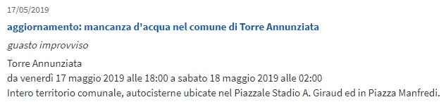 TORRE ANNUNZIATA. Aggiornamento guasto. L'acqua continuerà a mancare sino a stanotte
