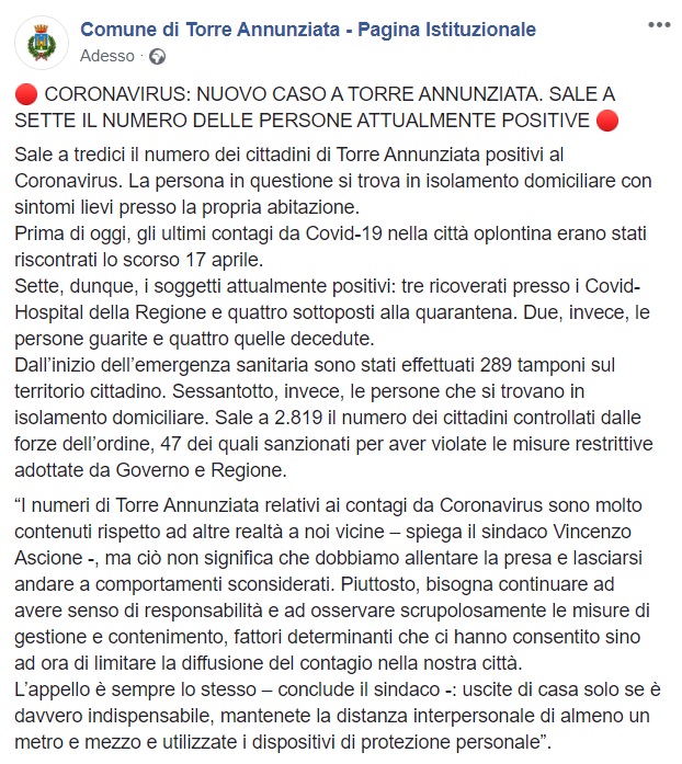Questo quanto pubblicato sulla pagina facebook del Comune di Torre Annunziata: