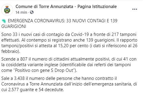 Questo il post pubblicato sulla pagina Facebook 'Comune di Torre Annunziata - Pagina istituzionale': "EMERGENZA CORONAVIRUS: 33 NUOVI CONTAGI E 139 GUARIGIONI. Sono 33 i nuovi casi di contagio da Covid-19 a fronte di 217 tamponi effettuati. Al contempo - si legge nel post - si registrano anche 139 guarigioni. Il rapporto tamponi/positivi si attesta al 15,20 per cento (i dati si riferiscono al 26 febbraio). Scende a 807 il numero di cittadini attualmente positivi, di cui 41 con la cosiddetta variante inglese (identificabile dai referti dei tamponi come “Positivo con gene S Drop Out”). Sale a 3.438 il numero delle persone che hanno contratto il Coronavirus a Torre Annunziata dall’inizio dell’emergenza sanitaria, di cui - conclude il post - 2.577 guarite e 54 decedute".