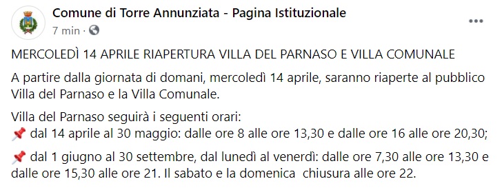 "A partire dalla giornata di domani, mercoledì 14 aprile, saranno riaperte al pubblico Villa del Parnaso e la Villa Comunale. -Si legge nella nota- Villa del Parnaso seguirà i seguenti orari: dal 14 aprile al 30 maggio: dalle ore 8 alle ore 13,30 e dalle ore 16 alle ore 20,30; dal 1 giugno al 30 settembre, dal lunedì al venerdì: dalle ore 7,30 alle ore 13,30 e dalle ore 15,30 alle ore 21. -Si legge nella nota- Il sabato e la domenica chiusura alle ore 22."