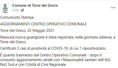 Questa parte del post pubblicato ieri sulla pagina Facebook 'Comune di Torre del Greco: "Comunicato Stampa. Aggiornamenti centro operativo comunale. Torre del Greco, 22 maggio 2021. Nessuna nuova guarigione è stata registrata - si legge nel post - nella giornata odierna, a Torre del Greco. Certificati 3 casi di positività al COVID-19, di cui 1 ripositivizzato. È quanto trasmesso dal Centro Operativo Comunale - dopo il consueto aggiornamento serale - conclude il post - con i Responsabili sanitari dell’%u200BASL Na3 Sud%u200B e con l’%u200BUnità di Crisi Regionale (...)".