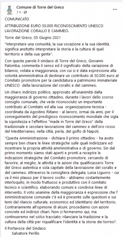 Questo il post pubblicato sulla pagina Facebook del comune di Torre del Greco. "Interpretare una comunità, la sua vocazione e la sua identità, significa anzitutto interpretare la storia e la cultura di quel territorio e della sua gente". Con queste parole il sindaco di Torre del Greco, Giovanni Palomba, commenta il senso ed il significato della variazione di bilancio, votata a maggioranza, con cui si è data espressione alla volontà amministrativa di destinare un contributo di 50.000 euro al Comitato promotore per la candidatura a patrimonio immateriale UNESCO della lavorazione del corallo e del cammeo. Un chiaro indirizzo - si legge nel post -politico, approvato all'unanimità dalla maggioranza di governo cittadino, durante i lavori dello scorso consiglio comunale, che vede riconosciuto un importante contributo al Comitato ed alla sua organizzazione tecnica - coordinata da Agostino Riitano - al lavoro, ormai da anni, per il conseguimento del prestigioso riconoscimento mondiale che sigla la squisitezza e l'effettivo "made in Torre del Greco" della tradizionale e secolare lavorazione del cammeo e dell'oro rosso del Mediterraneo, nella città, perla, del golfo di Napoli."Questa Amministrazione - dichiara il sindaco - ha avuto sempre ben chiare le linee strategiche sulle quali indirizzare ed incentrare la propria attività amministrativa e di governo. Sin dal primo momento - prosegue ancora il post - siamo stati aperti e pronti a recepire le indicazioni strategiche del Comitato promotore, cercando di favorire, al meglio, le attività e le azioni che qualificassero Torre del Greco autentica e sola capitale della lavorazione del corallo e del cammeo. Attraverso la consigliera delegata, Luisa Liguoro - cui va il mio plauso per il lavoro svolto - abbiamo costantemente interloquito, in modo fruttuoso e produttivo con il comitato tecnico e scientifico, elaborando comuni e condivise linee di intervento. Il voto unanime della maggioranza - si legge ancora - è espressione che l' Amministrazione comunale c'è ed è presente sulle questioni e sui temi del rilancio culturale, economico ed identitario del territorio. Contrariamente all'opinione di alcuni, procediamo con azioni concrete ed indirizzi chiari. Non ci fermeremo qui, ma continueremo nel solco tracciato: rilanciare la tradizione e la cultura della città - conclude il post - per riqualificare l'identità e la storia dei torresi".Il Portavoce del Sindaco Salvatore Perillo