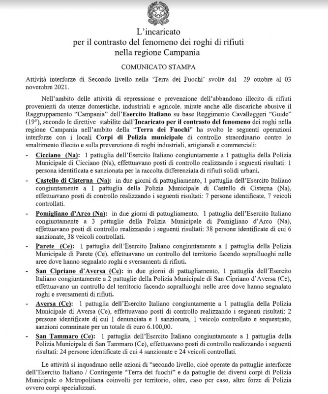 "Attività interforze di Secondo livello nella ‘Terra dei Fuochi’ svolte dal 29 ottobre al 03 novembre 2021. Nell’ambito delle attività di repressione e prevenzione dell’abbandono illecito di rifiuti provenienti da utenze domestiche, industriali e agricole, mirate anche alle discariche abusive il Raggruppamento “Campania” dell’Esercito Italiano su base Reggimento Cavalleggeri “Guide” (19°), secondo le direttive stabilite- si legge nella nota- dall’Incaricato per il contrasto del fenomeno dei roghi nella regione Campania nell’ambito della “Terra dei Fuochi” ha svolto le seguenti operazioni interforze con i locali Corpi di Polizia municipale di controllo straordinario contro lo smaltimento illecito e sulla prevenzione di roghi industriali, artigianali e commerciali: - Cicciano (Na): 1 pattuglia dell’Esercito Italiano congiuntamente a 1 pattuglia della Polizia Municipale di Cicciano (Na), effettuavano posti di controllo realizzando i seguenti risultati: 1 persona identificata e sanzionata per la raccolta differenziata di rifiuti solidi urbani. - Castello di Cisterna (Na): in due giorni di pattugliamento, 1 pattuglia dell’Esercito Italiano congiuntamente a 1 pattuglia della Polizia Municipale di Castello di Cisterna (Na), effettuavano posti di controllo realizzando i seguenti risultati: 7 persone identificate, 7 veicoli controllati. - Pomigliano d’Arco (Na): in due giorni di pattugliamento, 1 pattuglia dell’Esercito Italiano congiuntamente a 3 pattuglie della Polizia Municipale di Pomigliano d’Arco (Na), effettuavano posti di controllo realizzando i seguenti risultati: 38 persone identificate di cui 6 sanzionate, 38 veicoli controllati. - Parete (Ce): 1 pattuglia dell’Esercito Italiano congiuntamente- si legge nella nota- a 1 pattuglia della Polizia Municipale di Parete (Ce), effettuavano un controllo del territorio facendo sopralluoghi nelle aree dove hanno segnalato roghi e sversamenti di rifiuti. - San Cipriano d’Aversa (Ce): in due giorni di pattugliamento, 1 pattuglia dell’Esercito Italiano congiuntamente a 2 pattuglie della Polizia Municipale di San Cipriano d’Aversa (Ce), effettuavano un controllo del territorio facendo sopralluoghi nelle aree dove hanno segnalato roghi e sversamenti di rifiuti. - Aversa (Ce): 1 pattuglia dell’Esercito Italiano congiuntamente a 1 pattuglia della Polizia Municipale di Aversa (Ce), effettuavano posti di controllo realizzando i seguenti risultati: 2 persone identificate di cui 1 denunciata e 1 sanzionata, 1 veicolo controllato e sequestrato, sanzioni comminate per un totale di euro 6.100,00. - San Tammaro (Ce): 1 pattuglia dell’Esercito Italiano congiuntamente a 1 pattuglia della Polizia Municipale di San Tammaro (Ce), effettuavano posti di controllo realizzando i seguenti risultati: 24 persone identificate di cui 4 sanzionate e 24 veicoli controllati. Le attività si inquadrano nelle azioni di “secondo livello, cioè operate da pattuglie interforze dell’Esercito Italiano / Contingente “Terra dei fuochi” e da pattuglie dei diversi corpi di Polizia Municipale o Metropolitana coinvolti- si legge nella nota- per territorio, oltre, caso per caso, altre forze di Polizia ovvero corpi specializzati."