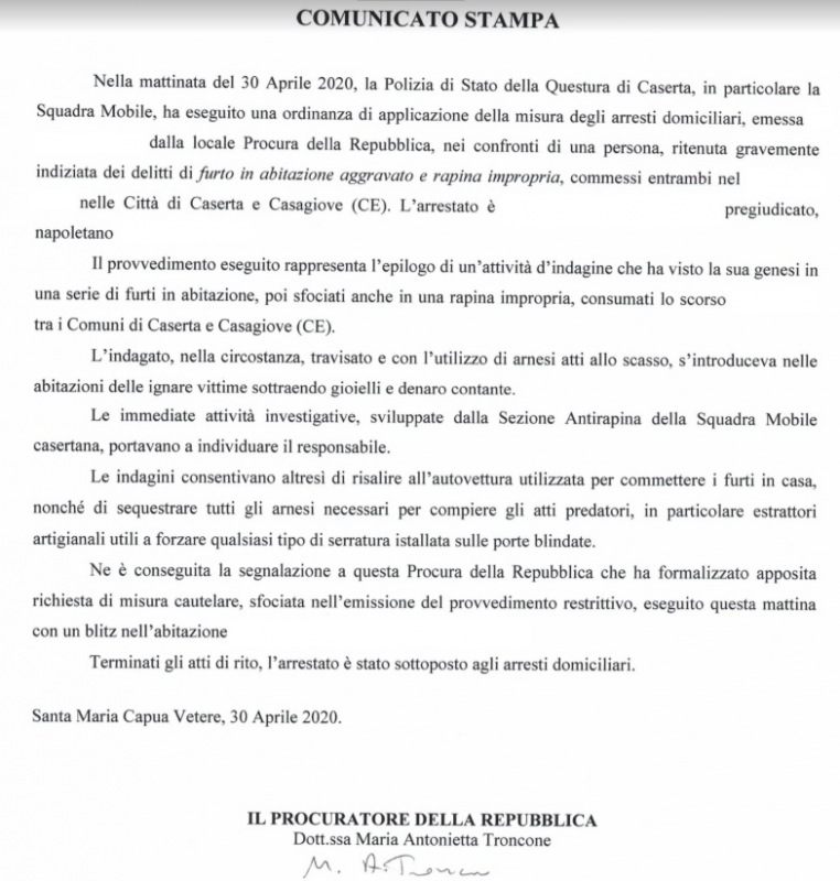 Pubblichiamo nota stampa della Procura di SMCV