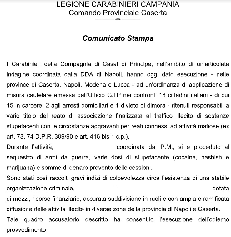 Pubblichiamo nota stampa Comando Provinciale Carabinieri di Caserta