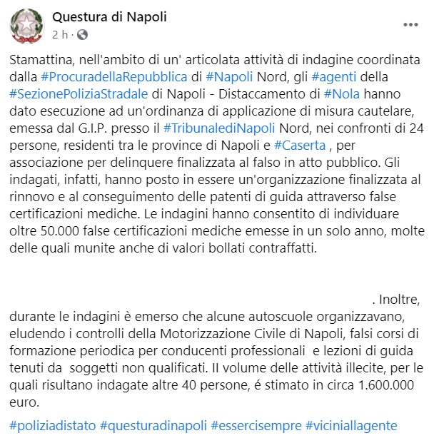 "Stamattina, nell'ambito di un' articolata attività di indagine coordinata dalla Procura della Repubblica di Napoli Nord, gli agenti della Sezione Polizia Stradale di Napoli - Distaccamento di Nola hanno dato esecuzione ad un'ordinanza di applicazione di misura cautelare, emessa dal G.I.P. presso il Tribunale di Napoli Nord, nei confronti di 24 persone, residenti tra le province di Napoli e Caserta , per associazione per delinquere finalizzata al falso in atto pubblico. -Si legge nella nota- Gli indagati, infatti, hanno posto in essere un'organizzazione finalizzata al rinnovo e al conseguimento delle patenti di guida attraverso false certificazioni mediche. Le indagini hanno consentito di individuare oltre 50.000 false certificazioni mediche emesse in un solo anno, molte delle quali munite anche di valori bollati contraffatti ... -Si legge nella nota- Inoltre, durante le indagini è emerso che alcune autoscuole organizzavano, eludendo i controlli della Motorizzazione Civile di Napoli, falsi corsi di formazione periodica per conducenti professionali e lezioni di guida tenuti da soggetti non qualificati. II volume delle attività illecite, per le quali risultano indagate altre 40 persone, é stimato in circa 1.600.000 euro."