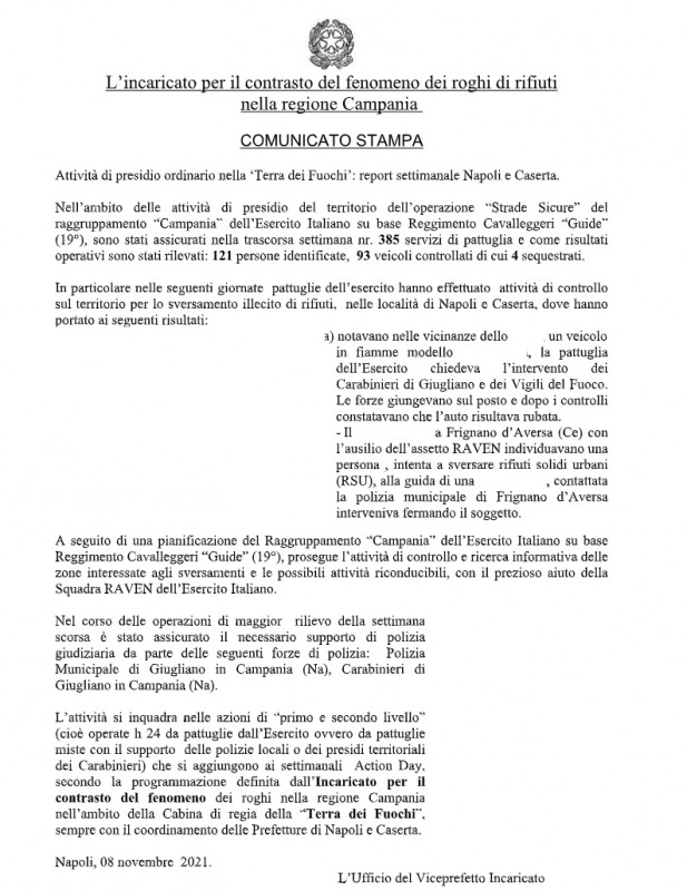 "Attività di presidio ordinario nella ‘Terra dei Fuochi’: report settimanale Napoli e Caserta. Nell’ambito delle attività di presidio del territorio dell’operazione “Strade Sicure” del raggruppamento “Campania” dell’Esercito Italiano su base Reggimento Cavalleggeri “Guide” (19°), sono stati assicurati nella trascorsa settimana nr. 385 servizi di pattuglia e come risultati operativi sono stati rilevati: 121 persone identificate, 93 veicoli controllati di cui 4 sequestrati. -Si legge nella nota- In particolare nelle seguenti giornate pattuglie dell’esercito hanno effettuato attività di controllo sul territorio per lo sversamento illecito di rifiuti, nelle località di Napoli e Caserta, dove hanno portato ai seguenti risultati: - Il ... a Giugliano in Campania (Na) notavano nelle vicinanze dello ... , un veicolo in fiamme modello ... , la pattuglia dell’Esercito chiedeva l’intervento dei Carabinieri di Giugliano e dei Vigili del Fuoco. -Si legge nella nota- Le forze giungevano sul posto e dopo i controlli constatavano che l’auto risultava rubata. - Il ... a Frignano d’Aversa (Ce) con l’ausilio dell’assetto RAVEN individuavano una persona , intenta a sversare rifiuti solidi urbani (RSU), alla guida di una ... , contattata la polizia municipale di Frignano d’Aversa interveniva fermando il soggetto. A seguito di una pianificazione del Raggruppamento “Campania” dell’Esercito Italiano su base Reggimento Cavalleggeri “Guide” (19°), prosegue l’attività di controllo e ricerca informativa delle zone interessate agli sversamenti e le possibili attività riconducibili, con il prezioso aiuto della Squadra RAVEN dell’Esercito Italiano. Nel corso delle operazioni di maggior rilievo della settimana scorsa è stato assicurato il necessario supporto di polizia giudiziaria da parte delle seguenti forze di polizia: Polizia Municipale di Giugliano in Campania (Na), Carabinieri di Giugliano in Campania (Na). -Si legge nella nota- L’attività si inquadra nelle azioni di “primo e secondo livello” (cioè operate h 24 da pattuglie dall’Esercito ovvero da pattuglie miste con il supporto delle polizie locali o dei presidi territoriali dei Carabinieri) che si aggiungono ai settimanali Action Day, secondo la programmazione definita dall’Incaricato per il contrasto del fenomeno dei roghi nella regione Campania nell’ambito della Cabina di regia della “Terra dei Fuochi”, sempre con il coordinamento delle Prefetture di Napoli e Caserta. Napoli, 08 novembre 2021."