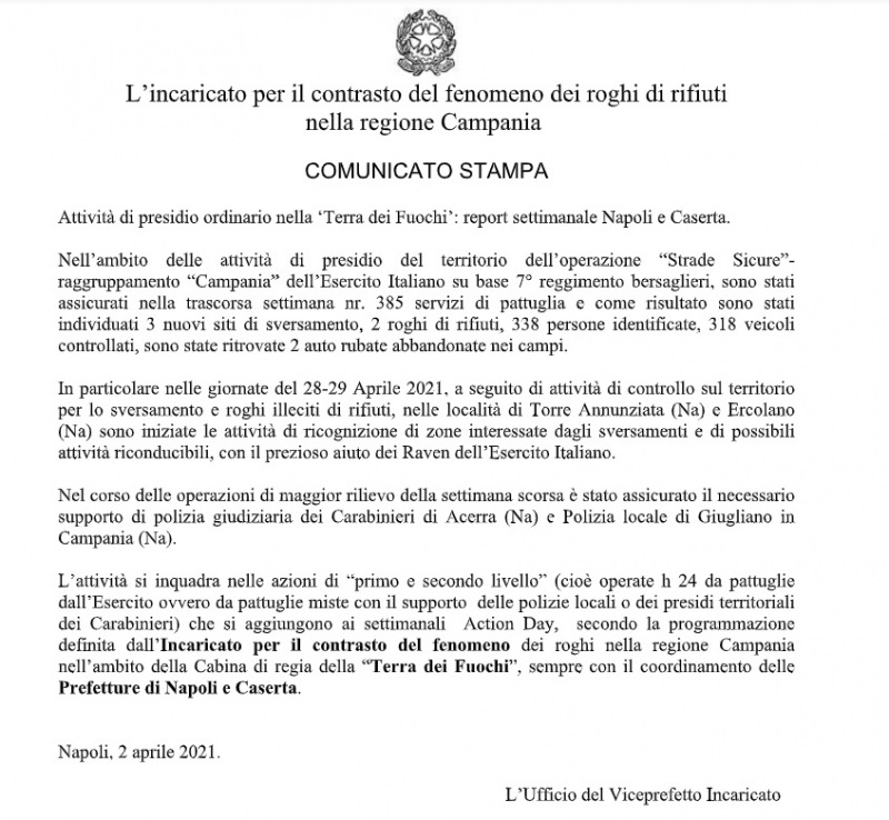 Questa la nota stampa dell’incaricato per il contrasto del fenomeno dei roghi di rifiuti nella regione Campania: