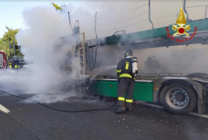 Pubblichiamo nota stampa dei Vigili del Fuoco: "Caserta 25 Agosto 2020 Poco prima delle 11:00 di questa mattina una squadra - si legge nella nota - dei Vigili del Fuoco di Caserta precisamente del distaccamento di Teano è intervenuta sull'A1 al km.728+400 del tratto autostradale SMCV- Capua. I Vigili del Fuoco, allertati dalla Polstrada, sono accorsi sul posto per domare le fiamme altissime che hanno avvolto la motrice di un mezzo pesante adibito al trasporto di autovetture. Sul posto oltre la squadra di Teano sono intervenute altre due squadre con una APS (autopompa serbatoio) ed una ABP (autobotte) provenienti - si legge nella nota - dalla sede centrale del Comando provinciale dei Vigili del Fuoco di Caserta. Insieme le squadre intervenute hanno evitato che il fuoco si propagasse al rimorchio dove non erano collocate macchine. Illeso l’autista che in un primo momento ha cercato invano con un estintore di spegnere l'incendio. L'opera di spegnimento si e completata alle ore 11:35 permettendo il regolare deflusso veicolare paralizzato precedentemente. Sul posto - si legge nella nota - presente la Polstrada di Caserta e personale della viabilità di Caserta."