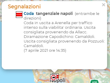 "Coda tangenziale napoli (entrambe le direzioni) Coda in uscita a Arenella per traffico intenso sulla viabilita' ordinaria. Uscita consigliata provenendo da Allacc. Diramazione Capodichino: Camaldoli. Uscita consigliata provenendo da Pozzuoli: Camaldoli."
