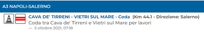 TRAFFICO sull'A3. "Coda tra Cava de' Tirreni e Vietri sul Mare per lavori"