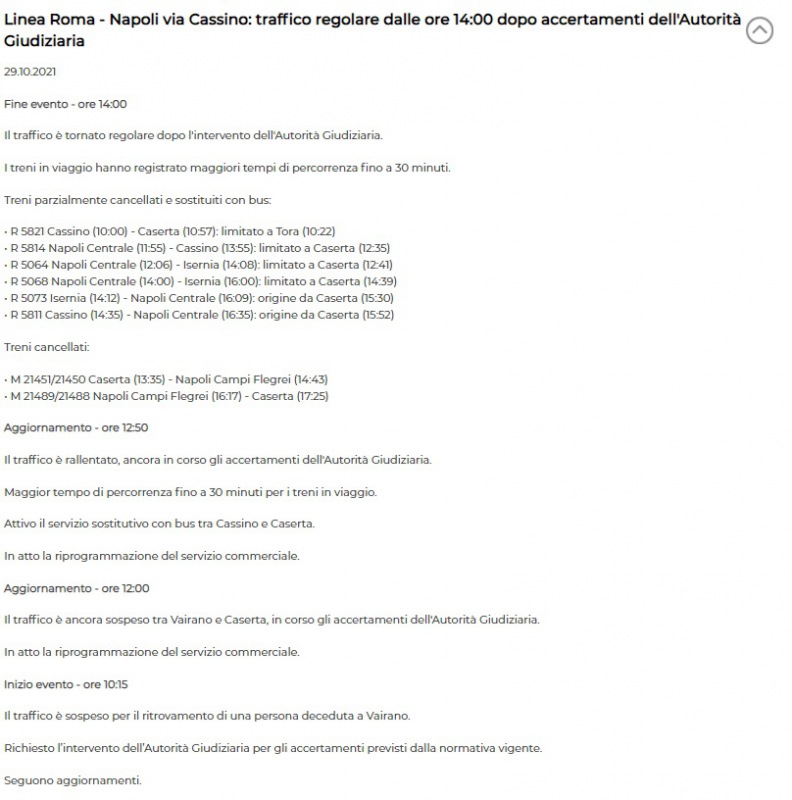 Aggiornamento - ore 12:00 Il traffico è ancora sospeso tra Vairano e Caserta, in corso gli accertamenti dell'Autorità Giudiziaria. In atto la riprogrammazione del servizio commerciale. Inizio evento - ore 10:15 Il traffico è sospeso per il ritrovamento di una persona deceduta a Vairano. Richiesto l’intervento dell’Autorità Giudiziaria per gli accertamenti previsti dalla normativa vigente. Seguono aggiornamenti.