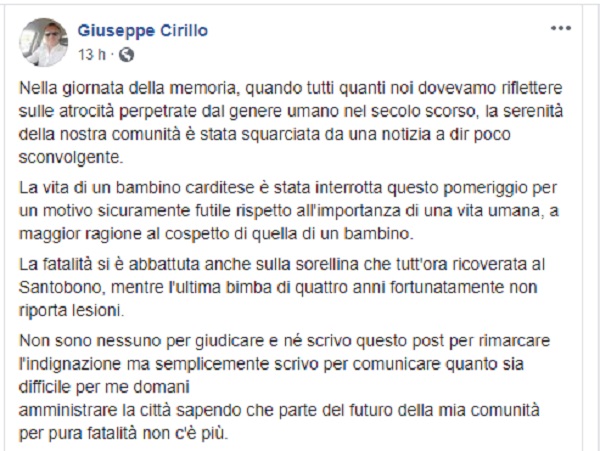 Questo il post pubblicato sulla pagina fb ufficiale del Sindaco di Cardito Giuseppe Cirillo.