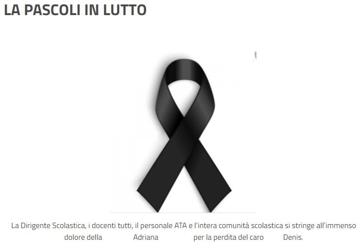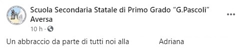 Questo il messaggio di cordoglio che apprendiamo dalla pagina facebook della Scuola Secondaria Statale di Primo Grado "G.Pascoli" Aversa: "Un abbraccio da parte di tutti noi alla ... Adriana LA PASCOLI IN LUTTO La Dirigente Scolastica, i docenti tutti - si legge nella nota -, il personale ATA e l’intera comunità scolastica si stringe all’immenso dolore della ... Adriana ... per la perdita del caro ... Denis.