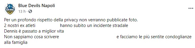 E questo della società Blue Devils Napoli: "Per un profondo rispetto della privacy non verranno pubblicate foto. 2 nostri ex atleti ... hanno subito un incidente stradale ... Dennis è passato a miglior vita ... Non sappiamo cosa scrivere ... e facciamo le più sentite condoglianze alla famiglia ..."