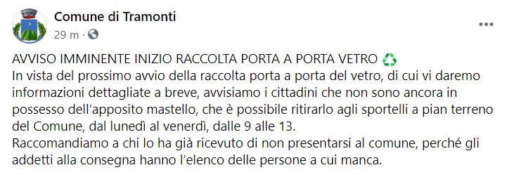 Questo quanto pubblicato sulla pagina facebook del Comune di Tramonti: