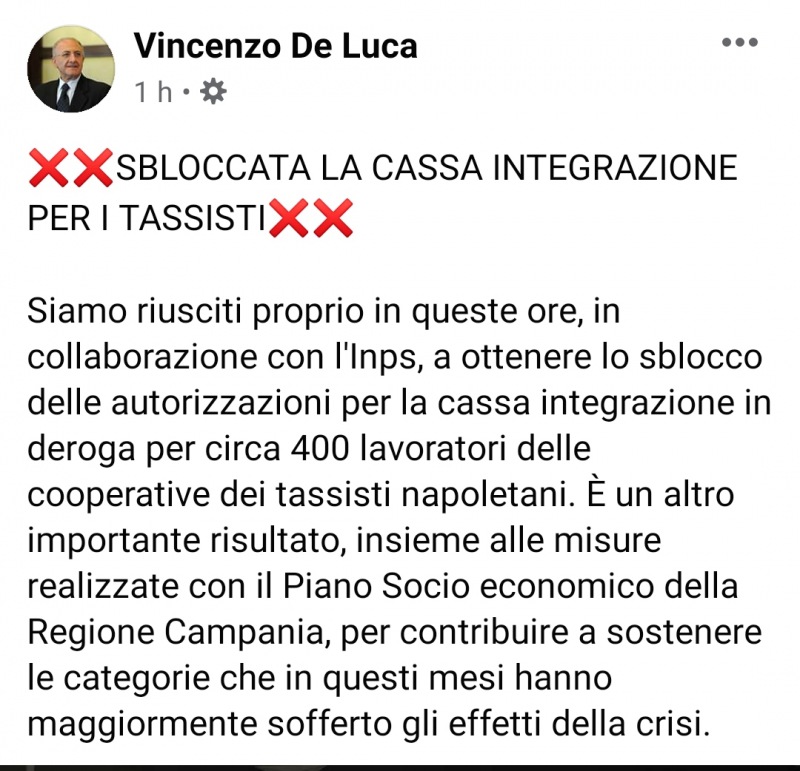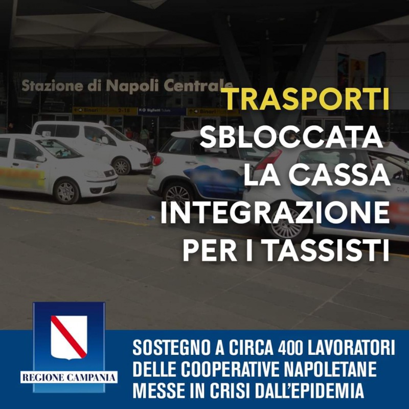 Siamo riusciti proprio in queste ore, in collaborazione con l'Inps, a ottenere lo sblocco delle autorizzazioni per la cassa integrazione in deroga per circa 400 lavoratori delle cooperative dei tassisti napoletani. È un altro importante risultato, insieme alle misure realizzate con il Piano Socio economico della Regione Campania, per contribuire a sostenere le categorie che in questi mesi hanno maggiormente sofferto gli effetti della crisi."