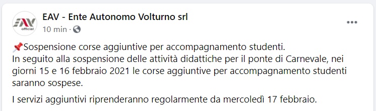 Questo quanto pubblicato sulla pagina facebook dell'EAV: "Sospensione corse aggiuntive per accompagnamento studenti. In seguito alla sospensione delle attività didattiche per il ponte di Carnevale - si legge nella nota -, nei giorni 15 e 16 febbraio 2021 le corse aggiuntive per accompagnamento studenti saranno sospese. I servizi aggiuntivi riprenderanno regolarmente da mercoledì 17 febbraio."