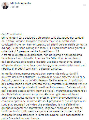Questo parte del post pubblicato dal Sindaco di Trentola Ducenta Michele Apicella: "Cari Concittadini, prima di ogni cosa desidero aggiornarvi sulla situazione dei contagi nel nostro Comune. Il ricordo fondamentale - si legge nel post - va ai nostri venti concittadini che non hanno superato gli effetti della malattia contratta. Ad oggi, le persone contagiate sono 133, l’incremento nella giornata odierna è di 3 persone mentre i guariti sono 15. A fronte di questo miglioramento - prosegue il post - non possiamo e non dobbiamo banalizzare il sacrificio di chi non ce l’ha fatta. Non demordiamo dall’osservanza delle regole imposte: uso della mascherina, anche all’aperto, distanziamento sociale, lavaggio frequente delle mani, uso ripetuto di prodotti sanificanti a base idroalcolica. In merito alle numerose segnalazioni pervenute e riguardanti il muretto dell’area antistante il plesso delle scuole materne - prosegue il post - di via N. S. Antonio, devo fare un po’ di chiarezza. Nell’intervento di ripristino dell’intero spazio è stato previsto che sul muretto in questione venisse adeguatamente ripristinato il rivestimento in marmo. Dei vandali, solo così possono essere definiti, hanno divelto il muretto abbandonando i detriti dell’abbattimento sul posto. Abbiamo già provveduto ad accantonare - si legge ancora nel post - questi detriti e nei prossimi giorni provvederemo alla completa ripresa del muretto stesso. A proposito di questo spazio, mi sono stati segnalati dei video che evidenziano le malefatte di un gruppo di ragazzi che scorrazzano, litigano e compiono vari atti di bullismo. Invito tutti quanti vengono a conoscenza di questi atti a chiamare immediatamente le Forze dell’Ordine. Solo così - prosegue il post - possiamo porre fine alle loro scorribande".