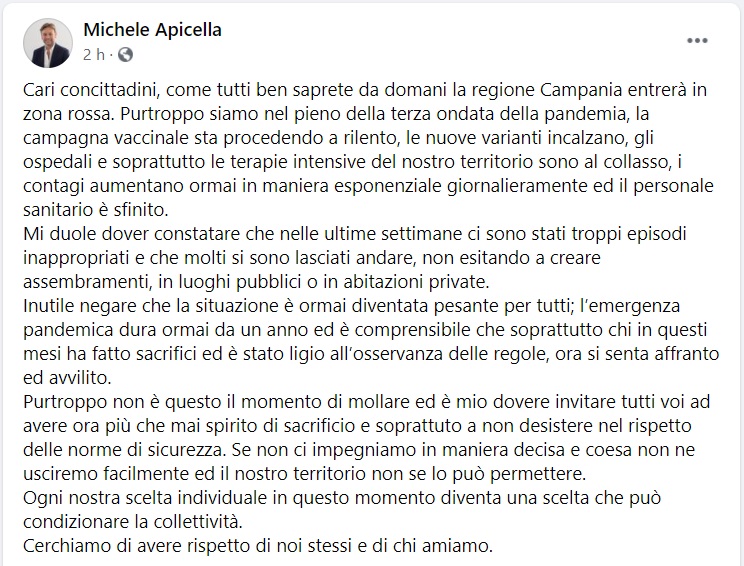 Questo quanto apprendiamo dalla pagina fb del Sindaco di Trentole Ducenta: "Cari concittadini, come tutti ben saprete da domani la regione Campania entrerà in zona rossa. Purtroppo siamo nel pieno della terza ondata della pandemia - si legge nella nota -, la campagna vaccinale sta procedendo a rilento, le nuove varianti incalzano, gli ospedali e soprattutto le terapie intensive del nostro territorio sono al collasso, i contagi aumentano ormai in maniera esponenziale giornalieramente ed il personale sanitario è sfinito. Mi duole dover constatare che nelle ultime settimane ci sono stati troppi episodi inappropriati e che molti si sono lasciati andare, non esitando a creare assembramenti, in luoghi pubblici o in abitazioni private. Inutile negare che la situazione è ormai diventata pesante per tutti - si legge nella nota -; l’emergenza pandemica dura ormai da un anno ed è comprensibile che soprattutto chi in questi mesi ha fatto sacrifici ed è stato ligio all’osservanza delle regole, ora si senta affranto ed avvilito. Purtroppo non è questo il momento di mollare ed è mio dovere invitare tutti voi ad avere ora più che mai spirito di sacrificio e soprattuto a non desistere nel rispetto delle norme di sicurezza. Se non ci impegniamo in maniera decisa e coesa non ne usciremo facilmente ed il nostro territorio non se lo può permettere. Ogni nostra scelta individuale in questo momento diventa una scelta che può condizionare la collettività - si legge nella nota -. Cerchiamo di avere rispetto di noi stessi e di chi amiamo."