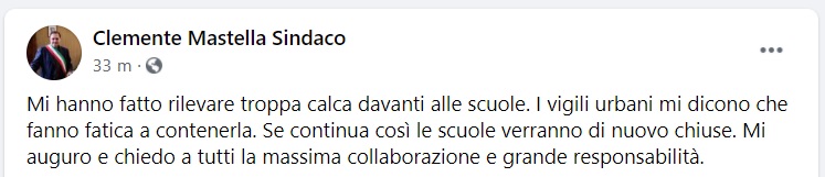 Questo quanto pubblicato sulla pagina fb del Sindaco Mastella: "Mi hanno fatto rilevare troppa calca davanti alle scuole. I vigili urbani mi dicono che fanno fatica a contenerla - si legge nella nota -. Se continua così le scuole verranno di nuovo chiuse. Mi auguro e chiedo a tutti la massima collaborazione e grande responsabilità."