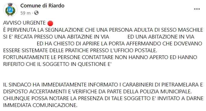 Questo quanto apprendiamo dalla pagina fb del Comune di Riardo: "AVVISO URGENTE È PERVENUTA LA SEGNALAZIONE CHE UNA PERSONA ADULTA DI SESSO MASCHILE SI E' RECATA PRESSO UNA ABITAZINE IN VIA ... ED UNA ABITAZIONE IN VIA ... ED HA CHIESTO DI APRIRE LA PORTA AFFERMANDO CHE DOVEVANO ESSERE SISTEMATE DELLE PRATICHE PRESSO L'UFFICIO POSTALE. FORTUNATAMENTE LE PERSONE CONTATTATE NON HANNO APERTO ED HANNO RIFERITO CHE IL SOGGETTO IN QUESTIONE E' ... IL SINDACO HA IMMEDIATAMENTE INFORMATO I CARABINIERI DI PIETRAMELARA E DISPOSTO ACCERTAMENTI E VERIFICHE DA PARTE DELLA POLIZIA MUNICIPALE. CHIUNQUE POSSA NOTARE LA PRESENZA DI TALE SOGGETTO E' INVITATO A DARNE IMMEDIATA COMUNICAZIONE."