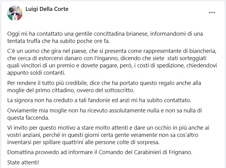 Questo quanto pubblicato sulla pagina fb del Sindaco di Villa di Briano
