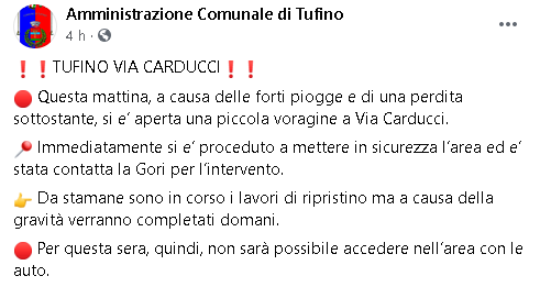 "TUFINO VIA CARDUCCI. Questa mattina, a causa delle forti piogge e di una perdita sottostante, si e’ aperta una piccola voragine a Via Carducci. Immediatamente si è proceduto a mettere in sicurezza l’area ed è stata contatta la Gori per l’intervento. Da stamane sono in corso i lavori di ripristino ma a causa della gravità verranno completati domani. Per questa sera, quindi, non sarà possibile accedere nell’area con le auto."