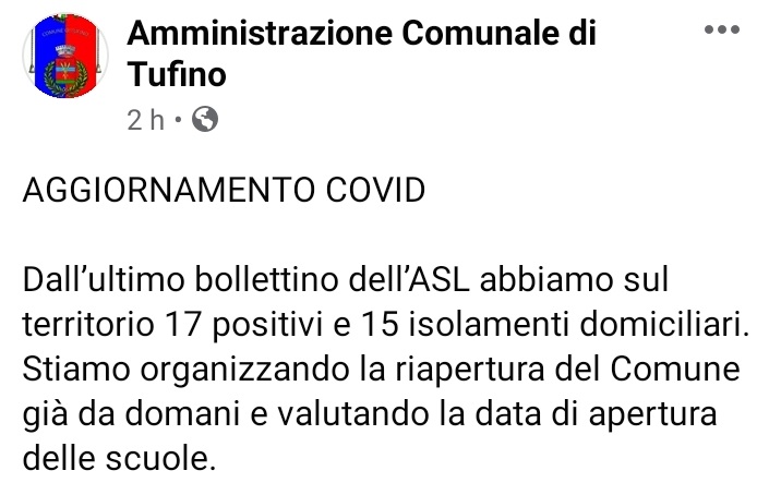 Lo apprendiamo dalla pagina Facebook dell'amministrazione comunale di Tufino