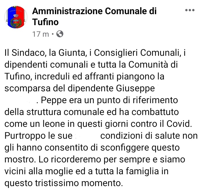 Lo apprendiamo dalla pagina Facebook del Comune di Tufino