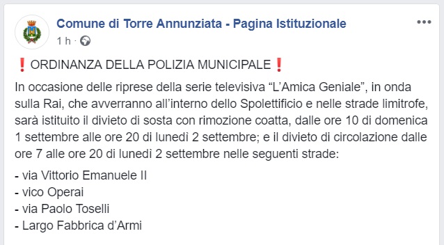 Questo quanto si apprende dalla pagina FB del Comune di Torre Annunziata
