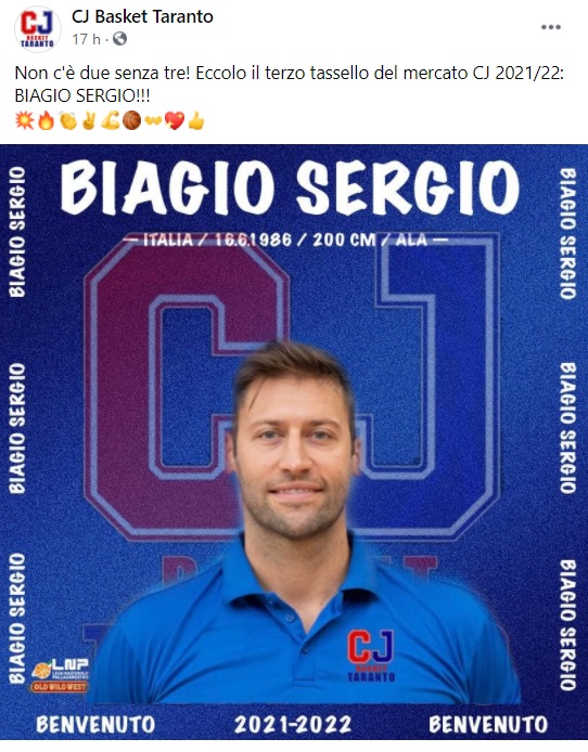 Questo quanto apprendiamo dalla pagina fb JC Basket Taranto: "Non c'è due senza tre! Eccolo il terzo tassello del mercato CJ 2021/22: BIAGIO SERGIO!!!"